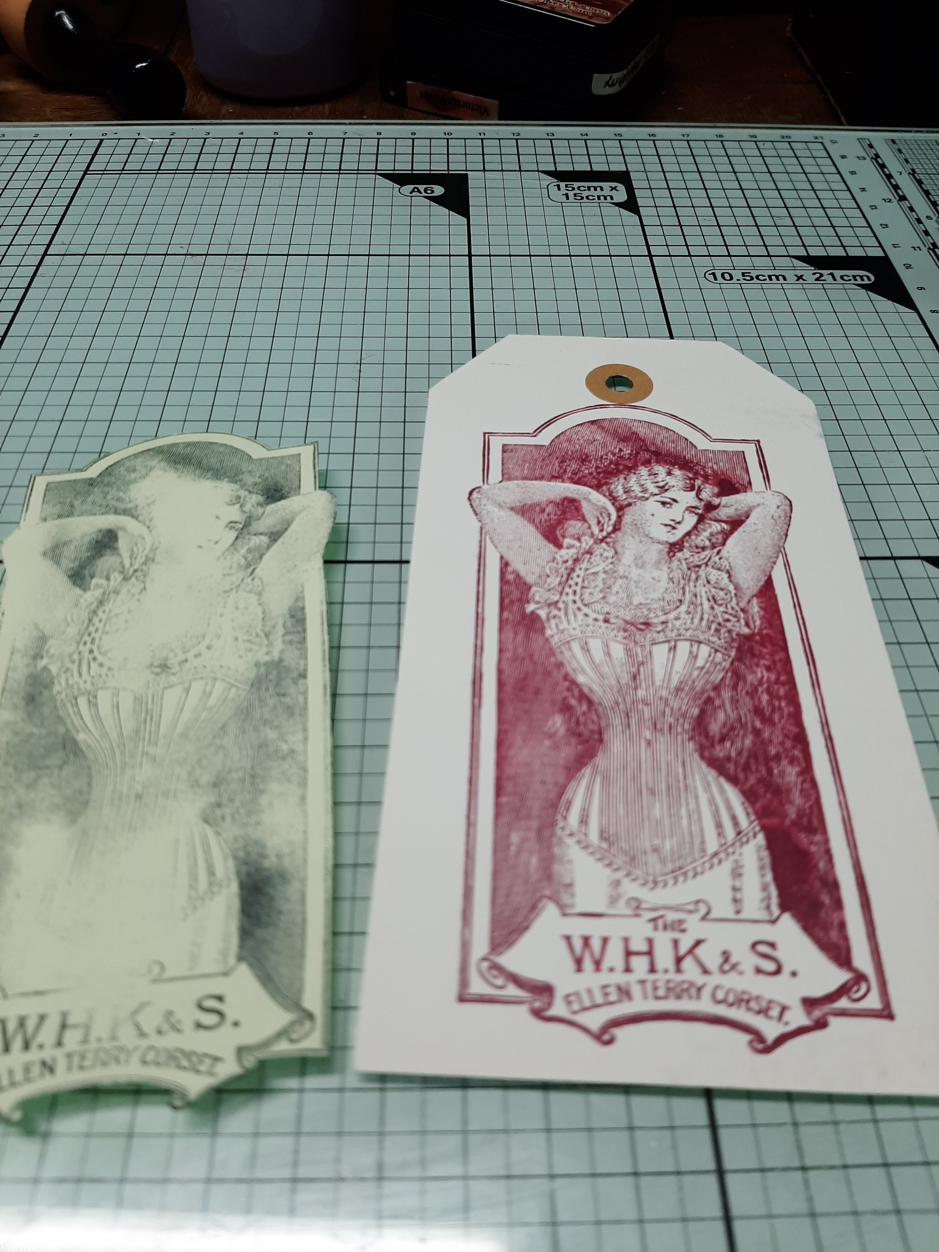 Stamp the beautiful lady from the labels sheet with the Versa magic on the small tag.